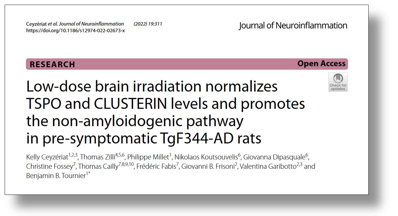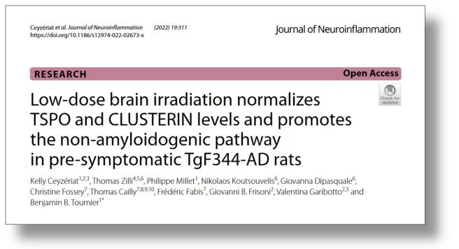 Title: Low-dose brain irradiation normalizes TSPO and CLUSTERIN levels and promotes the non-amyloidogenic pathway in pre-symptomatic TgF344-AD rats.