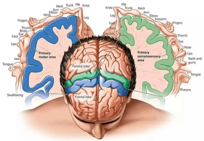 The location of the primary motor cortex in the brain (blue region). Source: Instagram