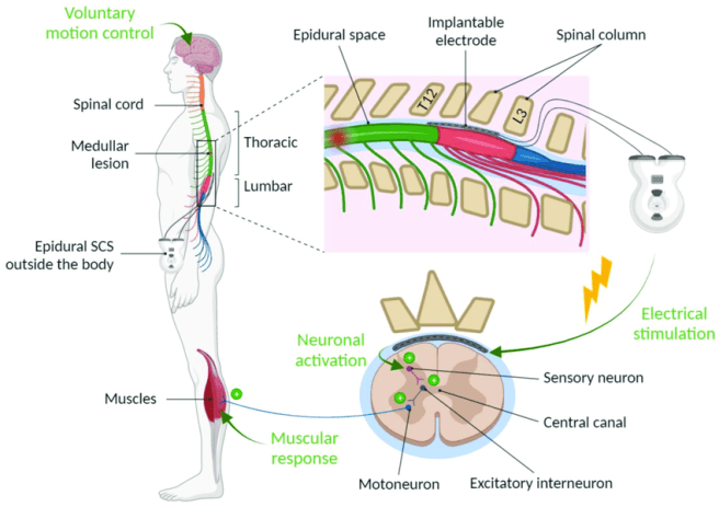 In this study, the researchers provided the results of the STIMO (STImulation Movement Overground) study. In their report, they presented the use of an implanted pulse generator to deliver trains of selective stimulation to the lumbosacral spinal cord (the lower region of the spine which controls leg muscles) in people who had suffered spinal cord injuries. This selective stimulation is called epidural electrical stimulation.