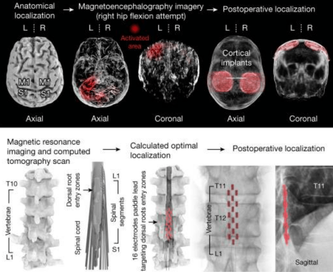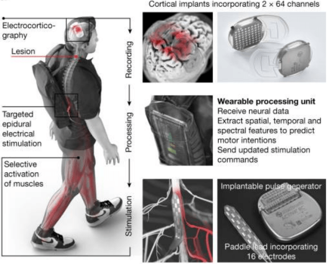 These recording devices collected brain activity and fed it to a wearable processing unit that the individual wore on their back, and this sent instructions to an implanted stimulator and electrode array which sat on the lumbar spinal cord: