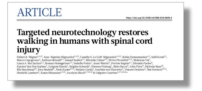 Authors: Wagner FB, Mignardot JB, Le Goff-Mignardot CG, Demesmaeker R, Komi S, Capogrosso M, Rowald A, Seáñez I, Caban M, Pirondini E, Vat M, McCracken LA, Heimgartner R, Fodor I, Watrin A, Seguin P, Paoles E, Van Den Keybus K, Eberle G, Schurch B, Pralong E, Becce F, Prior J, Buse N, Buschman R, Neufeld E, Kuster N, Carda S, von Zitzewitz J, Delattre V, Denison T, Lambert H, Minassian K, Bloch J, Courtine G.