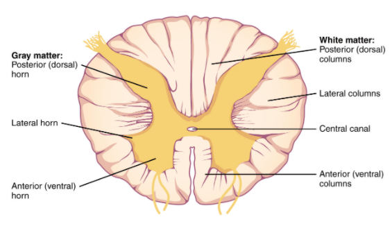 The spinal cord is divided into four different sections (the cervical, thoracic, lumbar, and sacral regions) and it consists primarily of two types of tissue: grey matter and white matter (grey matter being cell bodies and white matter involving a lot of myelinated neuronal fibers passing down through the spinal cord).