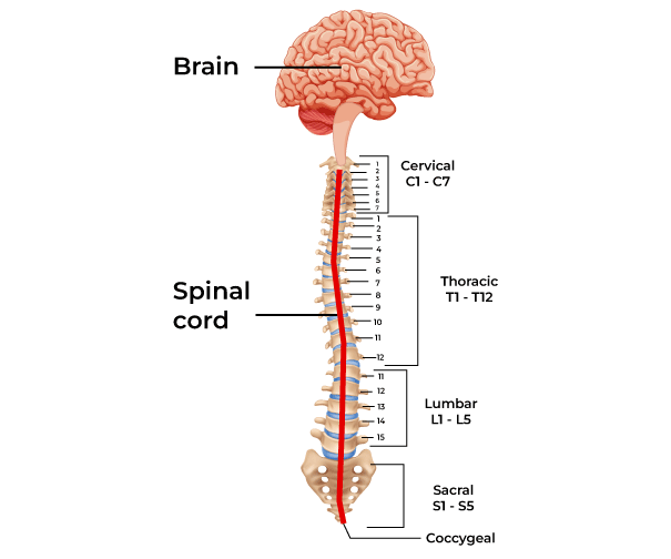 The spinal cord is a long, thin, tubular extension of the nervous tissue that stretches from the brainstem at the base of the brain down to the lower back. It is how the brain communicates with much of the peripheral body: