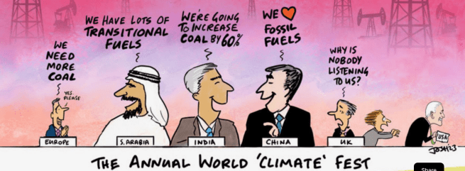December 12th – At the COP28 (“FLOP28”) climate summit in Dubai, a “consensus” was reached for countries to “transition away from fossil fuels”, the first such agreement in the conference’s 30-year history (?!?!). Great, but the transition is specifically for energy systems (meaning it completely excludes plastics, transport or agriculture). And these are the people who are going to save us…