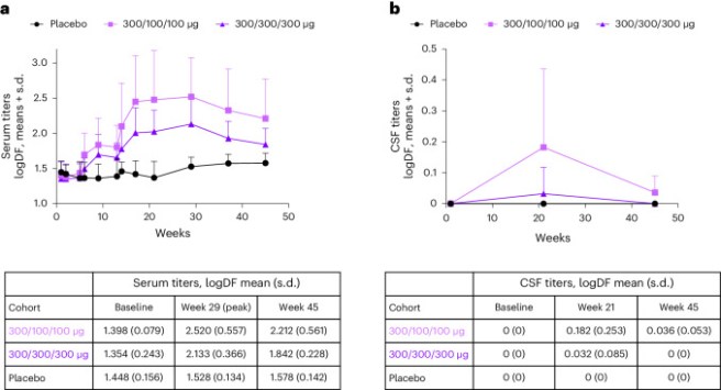 UB-312 or placebo were administered at weeks 1, 5 and 13. Serum (blood) measures in panel A. and cerebrospinal fluid (CSF) in panel B. Source: PMC
