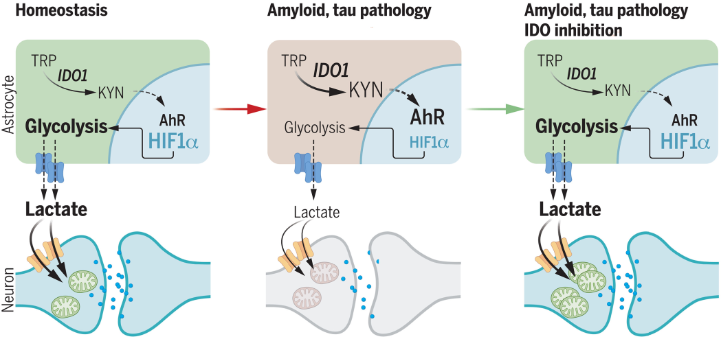Researchers report inhibition of indoleamine-2,3-dioxygenase 1 (IDO1) & production of kynurenine rescues hippocampal synaptic plasticity & memory function in models of amyloid & tau pathology (via astrocytic metabolic support of neurons – click here to read more about this and click here to read press summary on this research).