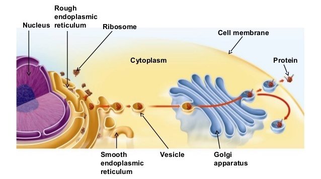 While DNA is the blue print, RNA is the facsimile of a region of DNA that is used for making a particular protein. While DNA is precious, unique, and must be carefully guarded, the copied version (RNA) is readily disposable. Once produced (or transcribed), each piece of RNA will exit the nucleus and enter an adjoining structure called the endoplasmic reticulum. On a very basic level, the endoplasmic reticulum is where the RNA facsimile of the instructions is used to produce protein.