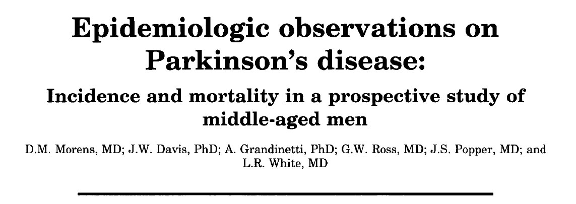 Title: Epidemiologic observations on Parkinson’s disease: incidence and mortality in a prospective study of middle-aged men.