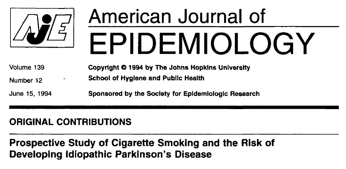 In this study the authors found that men who had smoked cigarettes at any time prior to their enrollment in the study in 1965, had a reduced risk of developing idiopathic Parkinson’s disease (relative risk = 0.39). That is to say, smoking reduced the chance of developing Parkinson’s disease. And a few years later the authors published a follow up paper which rejected the possibility that smoking was killing people before they could develop Parkinson’s disease (selective mortality representing a false positive). That follow up report can be found here.