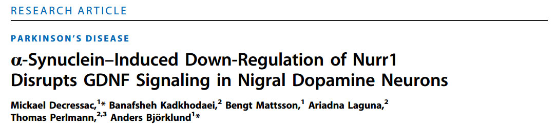 Title: α-Synuclein-induced down-regulation of Nurr1 disrupts GDNF signaling in nigral dopamine neurons.